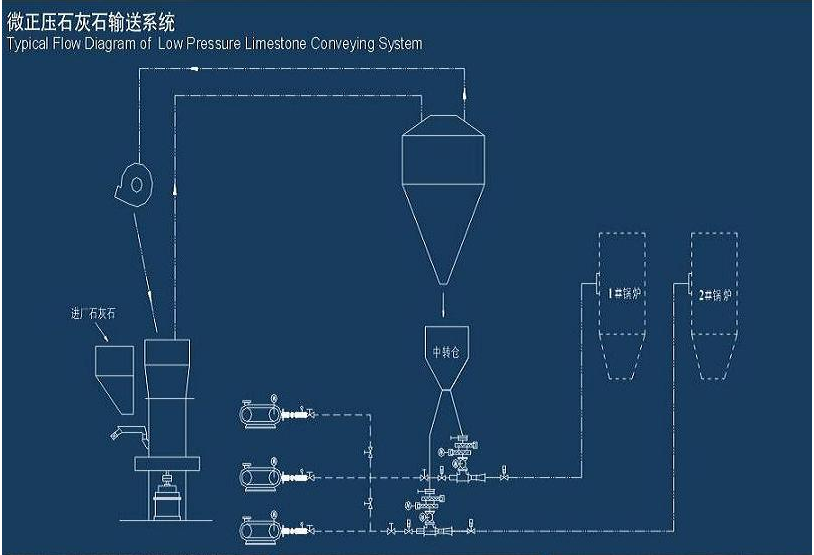 負壓輸送系統是利用低于1kg/cm2的氣體壓力,采用負壓(吸送式)方式并以較高的速度來拉動粉體物料使其通過管道輸送至灰庫,這種輸送方式混合比較低,但是具有下料現場干凈的顯著優點。
