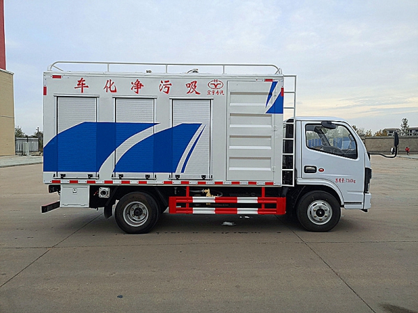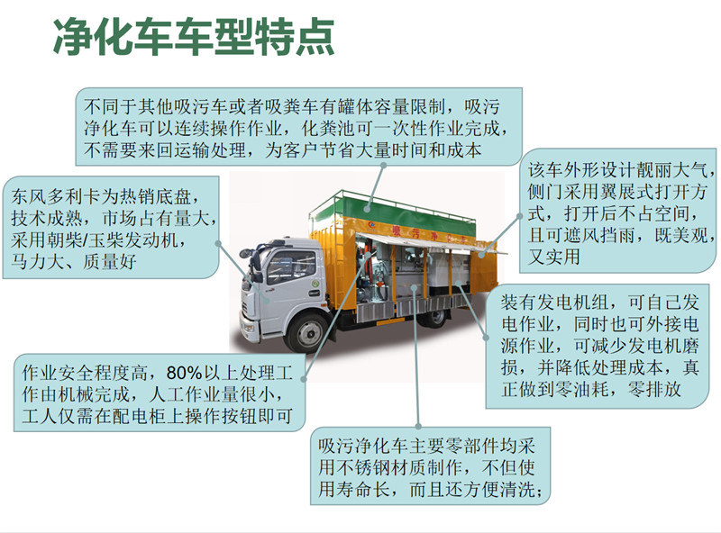 該車采用東風多利卡底盤,側門采用翼展式打開方式,且可遮風擋雨,既美觀,又實用,車輛廂體后部上方設計有LED廣告宣傳電子版,吸污凈化車可以連續操作作業,化糞池可一次性作業完成,設備每小時可出清水5-45立方,可榨出500-2000Kg糞餅,特別適用于對排放要求較高的城市。