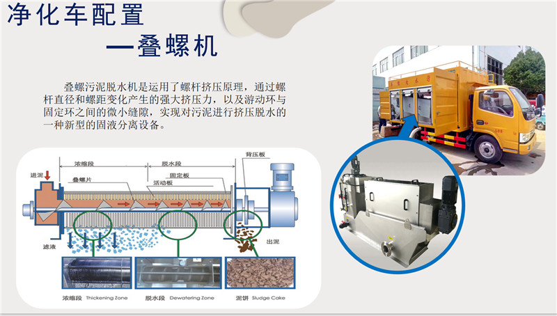 吸污凈化車是一款全新的車型,該設備主要經過三個程序,一是污渣分離,二是絮凝反應,三是固液脫水,首先要通過機器進行污渣分離,把固體垃圾如石塊、紙巾、塑料袋等雜質分離出去,產生出來大于15毫米的固體垃圾,這些固體垃圾可以當成生活廢棄物處理;固渣分離之后再進行下一步處理,進行藥水污水絮凝反應系統,將糞水與藥水攪拌絮凝反應結合;然后再將反應結合后的污物,進入最后的疊螺機脫水系統,成為有機生物肥料的原料,而脫出來的水達到市政污水排放三級標準,能將化糞池污物轉換成可再利用的資源,真正實現節能、環保、無害化,同時創造了經濟效益,提升環保事業的附加值。吸污凈化車由汽車底盤、夾一、中的絮凝劑通過加藥泵注入污水緩存池中進行絮凝反應,污水和絮凝劑在污水緩存處理池中進行絮凝反應結合后,然后再將反應結合后的污物,進入最后的疊螺機脫水系統,進行疊螺脫水,從而將污水中的糞便壓榨成有機肥,排出的水達到污水排放標準,該車型對所有只要可絮凝的污水均可以疊螺機脫水處理,達到污水排放標準。