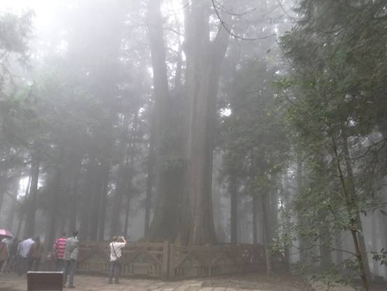 第二日一大早,我們沿著愛河,告別高雄,來到嘉義。午飯后我們的目的地是向往已久的阿里山。阿里山位于臺灣省嘉義市東方75公里,地處海拔高為2,216米,山上氣候涼爽。經過了單程2.5小時盤山公路的路程,一路顛簸,我們到達山頂。山上淅淅瀝瀝的下著小雨,幾經周折,我們看見了達到三千余年的紅檜,該樹木為日本技師小笠原富次郎于1906年11月發現,被日本人尊稱為“神木”。