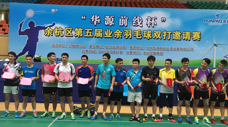 2015年5月31日,由源牌集團杭州華源前線能源設備有限公司獨家贊助的第五屆“華源前線杯“余杭區業余羽毛球雙打邀請賽在余杭區體育館圓滿落下帷幕。本次比賽共設男雙中年組、男雙青年組、混雙比賽三個獎項分組,共有來自余杭區工業園內的上市公司、外資公司、股份制銀行、公務員等企事業單位的羽毛球愛好者共200余人報名參加了本次比賽。 早8:30分,比賽正式開始,首先小組循環賽產生16強,隨后抽簽進入淘汰賽,運動員們在場上盡顯手腕技巧與柔韌身姿,近網小球、后場底線控制球、攻守轉換的銜接,贏得了場外觀眾的陣陣喝彩。賽后,主辦方宣讀了獲獎名單,贊助方代表、主辦方代表以及余杭區體育局相關領導分別上臺為獲獎運動員進行頒獎,并合影留念。 羽毛球在余杭區具有廣泛的群眾基礎,杭州華源前線能源設備有限公司希望通過高參與度的運動增強RUNPAQ的品牌影響力,華源前線致力于為客戶提供更安全、更清潔、更高效的能源設備,我們很高興地成為余杭區“炫動羽杭”的優選合作伙伴。