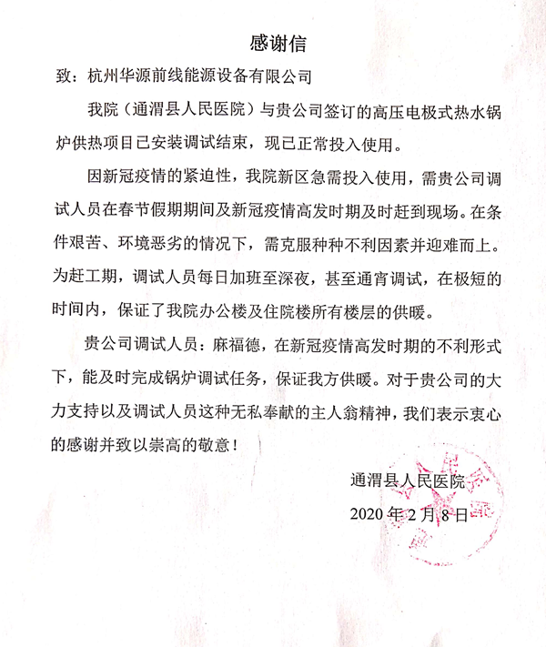 2月8日(正月十五)清晨, 經過五天五夜通宵安裝調試,甘肅通渭縣人民醫院新區(疫情收容點)的電極式熱水鍋爐供熱項目成功投入使用。醫院領導發來表揚信。感謝我公司員工辛勤工作,產品過硬。