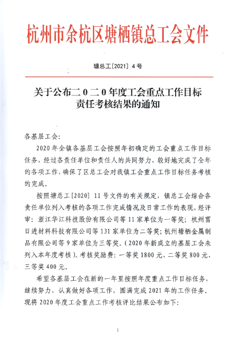 年度工會重點工作目標責任考核中獲得一等獎,這是我司工會在該項考核中首次獲得一等獎。在