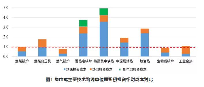 不考慮政府補貼,從全社會投資角度分析,單位供熱面積初投資成本包括熱源投資、熱網投資以及電供暖配電網(10kV及以下)改造成本;以4個月采暖季為例,估算每個采暖季單位供熱面積的運行成本,包括熱源成本以及人工、維護等其他成本(不含財務成本、稅等),以超低排放燃煤鍋爐集中供暖的單位供熱面積初投資和運行成本為基準,不同技術路線的相對成本如下圖。受多種因素影響,即使同一技術路線的不同項目實際成本也不盡相同,下述是基于部分案例的估算結果。