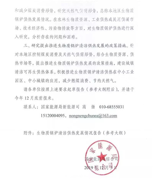 近日,國家能源局下發《國家能源局綜合司關于請報送生物質鍋爐清潔供熱有關情況的通知》,要求各地方能源局、發改委、有關中央企業報送生物質鍋爐清潔供熱相關情況。